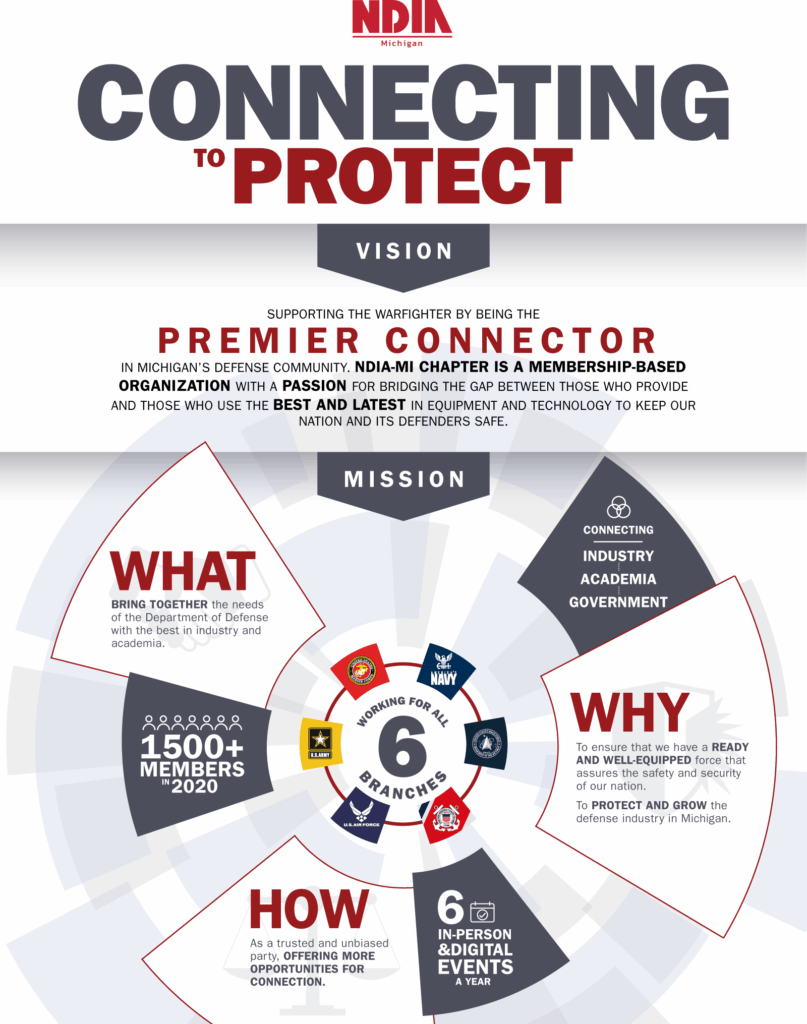 Supporting the warfighter by being the premier connector in Michigan’s defense community. NDIA Michigan Chapter is a membership-based organization with a passion for bridging the gap between those who provide and those who use the best and most capable equipment and technology to keep our nation and its defenders safe.